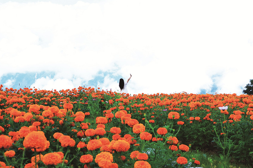 在這金風(fēng)送爽的秋日,瀘定德威加郡海子村18萬株萬壽菊競相綻放,漫步在花海之中,人們可以感受秋風(fēng)的輕撫,呼吸清新的空氣,寧靜的村寨依托著貢嘎雪山、藍天白云,在成片的萬壽菊裝點下構(gòu)成了一幅亮麗的鄉(xiāng)村畫卷。