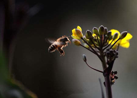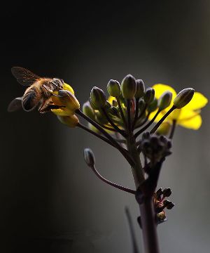 千百年來,許多小宗蔬菜的傳宗接代依靠中華蜜蜂授粉。紫油菜花在初春開放,這個(gè)季節(jié)西方蜜蜂因畏寒仍在巢中被人工飼養(yǎng),只有中華蜜蜂不怕寒冷,不嫌花源稀少,只要?dú)鉁剡_(dá)到8℃,它們就出勤了。 熊小立圖文 攝于成都