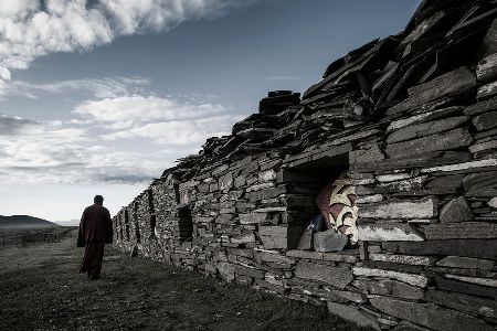 走近了,你會(huì)看見(jiàn)砌墻的石片上刻著密密麻麻的經(jīng)文;綿延的墻體上嵌著一個(gè)個(gè)窗口式的佛龕;每隔一段距離,石墻圍出一個(gè)回環(huán)的空間,類似于城墻上的烽火臺(tái);長(zhǎng)墻的兩端立著高大的佛塔,中段的108座佛塔排成長(zhǎng)長(zhǎng)的隊(duì)伍,和長(zhǎng)墻并行。