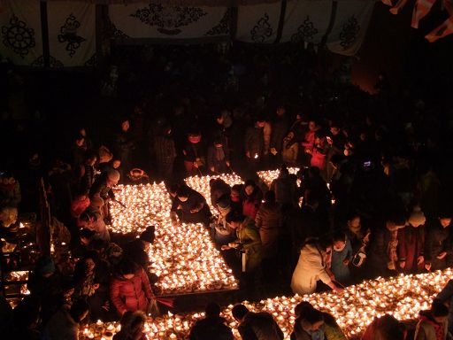 康定的幾座黃教寺廟舉行了法會,擺酥油花,燃元根燈供佛。信教群眾除在家供燈外,有的還登跑馬山,赴南無寺敬燈油。入夜后又成群結隊涌向康定城中的安覺寺,參加元根燈會,以此紀念藏傳佛教格魯派創(chuàng)始人、宗喀巴大師圓寂成佛。安覺寺里人潮涌動,熱鬧非凡。有扶老攜幼的信教群眾,有祈求平安的生意人,也有慕名而來的外地攝影師。燈會這天,最忙碌的除了寺廟里的喇嘛,就數在寺廟周圍站崗的消防員了,消防員李剛說:“一大早就有遠道而來的信教群眾和僧尼到寺廟里點燈了,為了保障寺廟的消防安全,我們已經在這飄著雪花的冬日里站了整整一天了,要等到每一盞燈都安全的燃盡,我們才可收隊離開。”
