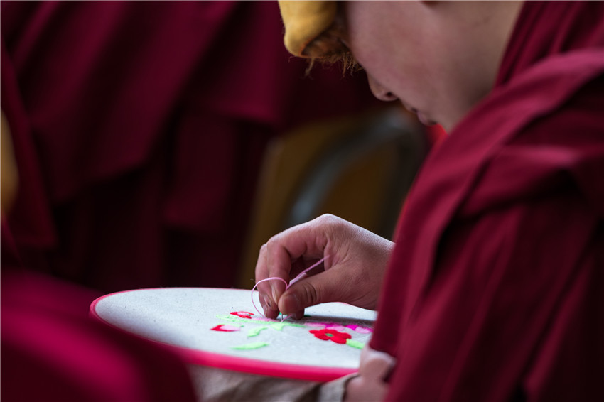 行攝途中經(jīng)過塔公鎮(zhèn)扎西寺,遇見康定市婦聯(lián)邀請到的中國國家級非物質(zhì)文化遺產(chǎn)藏羌織繡傳承人,正在為自愿報名的數(shù)十名覺姆傳授藏繡圖案基礎(chǔ)知識、藏繡圖案的常見表現(xiàn)形態(tài)、挑繡、納花繡、鏈子扣、扎花、提花、拼花、勾花和手繡等各種繡法技能。佛教的學(xué)習(xí)本是無止境的,我被這安靜、專注的場景深深感染,按下相機快門的一瞬就記錄了朵朵盛開在指尖的蓮花。