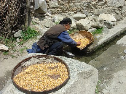 那天清晨,我們一行就乘坐曉雨哥所開(kāi)轎車從康定城出發(fā)了。從顯得很懸的山路上到位于山頂平壩的嵐安古鎮(zhèn)時(shí),才8點(diǎn)過(guò)一點(diǎn)。朝鎮(zhèn)里走去,先后見(jiàn)到了從地里背洋芋回家的小孩、從地里收了豆菽枯藤的中年人等。