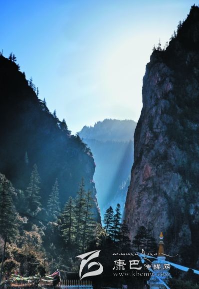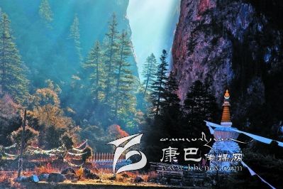 進(jìn)得溝來,卻又是另一番景致。溪水在窄細(xì)的深谷中忽隱忽現(xiàn),水聲叮咚,時(shí)而從碎石卵灘下潛淌,時(shí)而冒出雪花樣的身影,不張揚(yáng),含靦腆,與兩邊千仞峭崖的兇猛樣恰成強(qiáng)烈對(duì)比。此時(shí)容不得你不抬頭望山,望天了。極盡險(xiǎn)峻的峭壁奇峰,危巖巨石,陰面如潑了墨暈,陽面露了慘白,硬硬地把個(gè)溝谷擠成了“一線天”,駭?shù)谜锪锏奶焐弦粌蓤F(tuán)亂云也不敢停歇片刻,欲飄走,卻又被錯(cuò)落參差的山峰撕得七零八落。更有那墨黑如黛的松柏齊齊地排隊(duì)豎立在危崖峭壁間,或一兩階,或三四階,如挎刀武士護(hù)著峭崖,又如黑大漢長(zhǎng)的亂糟糟的絡(luò)腮胡,徒增添了猙獰之貌。傳說皮察溝內(nèi)有座黑教的神山——呷拉神山,每到“朝山會(huì)”,農(nóng)牧民前去神山朝拜。然而,呷拉山頂不知何時(shí)棲居了一只碩大的“夏甲曲絨”(意為一種兇惡的鳥),不時(shí)將村里百姓的牛、羊叼到山頂吞食。藏王格薩爾得知此事,決心要除掉“夏甲曲絨”。 “夏甲曲絨”得知格薩爾王大軍前來征服它,十分懼怕,數(shù)日藏于洞中不敢出來。格薩爾王隱身于巖石背后,讓王妃珠牡設(shè)法引“夏甲曲絨”出洞。“夏甲曲絨”形體碩大,棲息的洞無法掩其全身,頭部露在外面,時(shí)時(shí)觀察動(dòng)靜。珠牡到接近洞口的地方,滔滔不絕地贊譽(yù)“夏甲曲絨”長(zhǎng)得美麗,它禁不住贊美,漸漸地伸長(zhǎng)頭頸,最后驕傲地露出潔白的全身,并高昂著頭。格薩爾王趁機(jī)迅速張弓搭箭,一箭射中“夏甲曲絨”的頸部,血流滿山,以后這座山便變成了紅山。當(dāng)“夏甲曲絨”負(fù)痛逃至皮察溝“一線天”時(shí)已精疲力竭,便停留在山崖中。格薩爾王隨即趕到,藏于灌叢,背靠巨石用腳一蹬(至今天一巨石呈凹形,似有人蹬過),再次射中“夏甲曲絨”。“夏甲曲絨”負(fù)痛逃去,停在覺然村一巨石上做垂死掙扎時(shí),它的爪爪在巨石一抓了無數(shù)道溝痕,后人把這個(gè)巨大石稱為“鬼抓石”……我無意去尋找“紅山”、“腳蹬石”、“鬼爪石”等,也沒想深究格薩爾除妖是否用過“美人誘惑計(jì)”,但卻在溝谷里發(fā)現(xiàn)一個(gè)與眾不同的現(xiàn)象:在一處窄小的谷地路傍,長(zhǎng)滿了雜枝黑蔓的灌叢,灌叢上彩幡密布,鉆進(jìn)灌叢,里邊竟然塑了一尊格薩爾王的神象,神象不高大,卻威儀,的確像是藏在崖壁下灌叢中……很容易讓人想到故事中的情節(jié)。