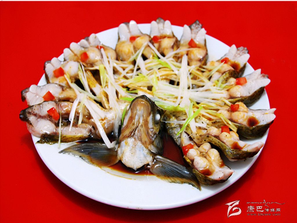 4、魚切開的脊背,順著自然的方向擺成花型,火腿和姜片插在間隔處。魚頭擺好,魚尾切段擺在魚頭旁邊。