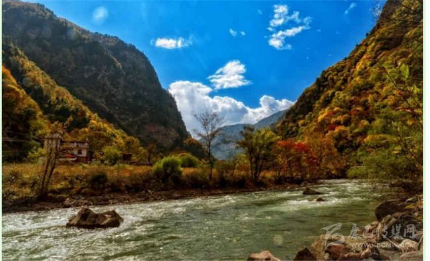 東谷河原名牦牛河,在丹巴縣五個(gè)主干水系中,它是最小的一條,兩岸多為峽谷地貌,僅在支溝匯合處出現(xiàn)有平壩草地。在陡峭高聳的河谷兩岸,針闊葉混交林呈現(xiàn)出深淺不同的綠色,既有青黛,墨綠,又有嫩綠,草青及四季輪番開花的不同品種的大小杜鵑。還不時(shí)有珍禽出沒。每當(dāng)秋高氣爽的季節(jié),一團(tuán)團(tuán),一簇簇的紅葉伴隨杜鵑花在林間綻放,伴以宛轉(zhuǎn)的啾啾鳥嗚;河水清澈明亮,時(shí)而奔騰而下,形成飛瀑,時(shí)而伴著叮咚之聲潺潺而過,這種美景何處能有?老革命家胡耀邦同志游覽后,對此青山綠水贊不絕口,并稱之為“天然盆景”!盆景藝術(shù)一向以“無聲的詩詞,立體的畫卷”來形容。牦牛谷景點(diǎn)正是一個(gè)有著巨大篇幅的詩詞,一個(gè)有著廣闊的立體畫卷。