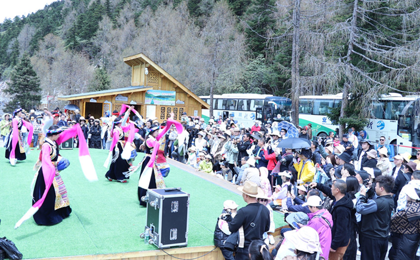 春雪消融,大地復蘇,高原上肅穆的景色正變得郁郁蔥蔥、多姿多彩起來。5月1日,康定情歌(木格措)風景區(qū)天氣晴好,高山杜鵑在山澗中次第開放,景區(qū)內人流如織,游客有的是一家老小有說有笑,有的是三五好友打卡拍照。行走在高山湖泊造就的自然環(huán)境中,耳畔是鳥兒和河水流動的和聲,信步林間,牧歌牛群,木格措清凜可人。在木格措觀景臺,還上演了14場藏族非遺歌舞,歡快的舞蹈和秀麗的風光讓游客沉醉其中、留戀忘返。