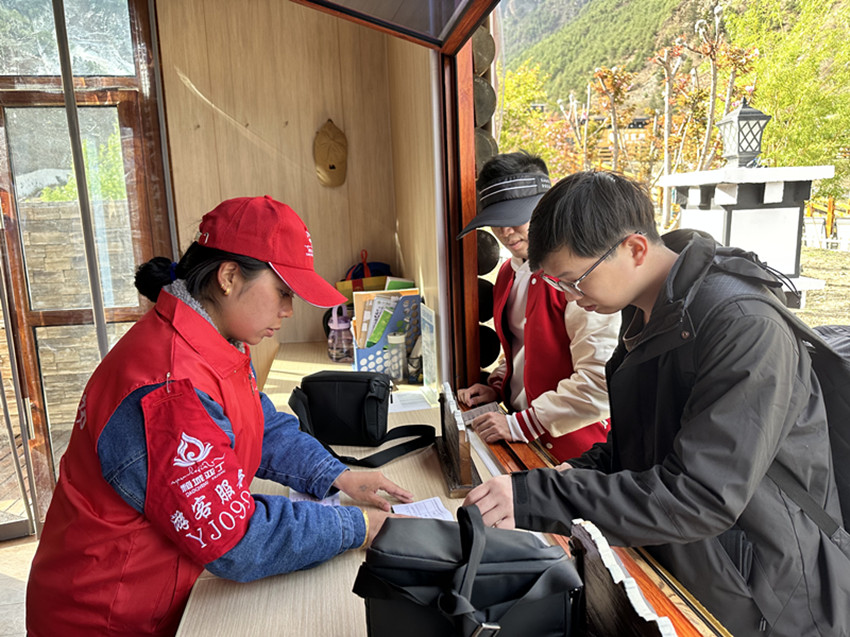 “我們?yōu)橛慰吞峁┞糜巫稍?、線路指引、文明旅游勸導、發(fā)放宣傳折頁等服務,同時還幫助游客在手機App、互聯(lián)網預訂酒店,規(guī)劃旅游線路,寄存包裹等,讓游客感受到亞丁景區(qū)是有溫度、有人情味的旅游目的地?!薄拔逡弧逼陂g稻城亞丁景區(qū)志愿者四郎曲初告訴記者。