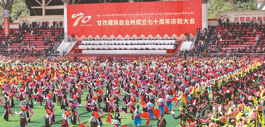 這一天,沿折多河兩岸的東西兩條大街上,人群如潮,青年學生的秧歌隊、腰鼓隊以及康定城各族各界人民組成的弦子隊,將古城康定揮舞成了一條人群歡樂的哈達,鞭炮聲、口號聲和歡呼聲響徹跑馬山麓。當晚,康定的四十八家鍋莊及主會場(后來的康定賓館內(nèi))燃起了一堆堆篝火,康定人民載歌載舞,通宵達旦,歡慶人民當家作主。