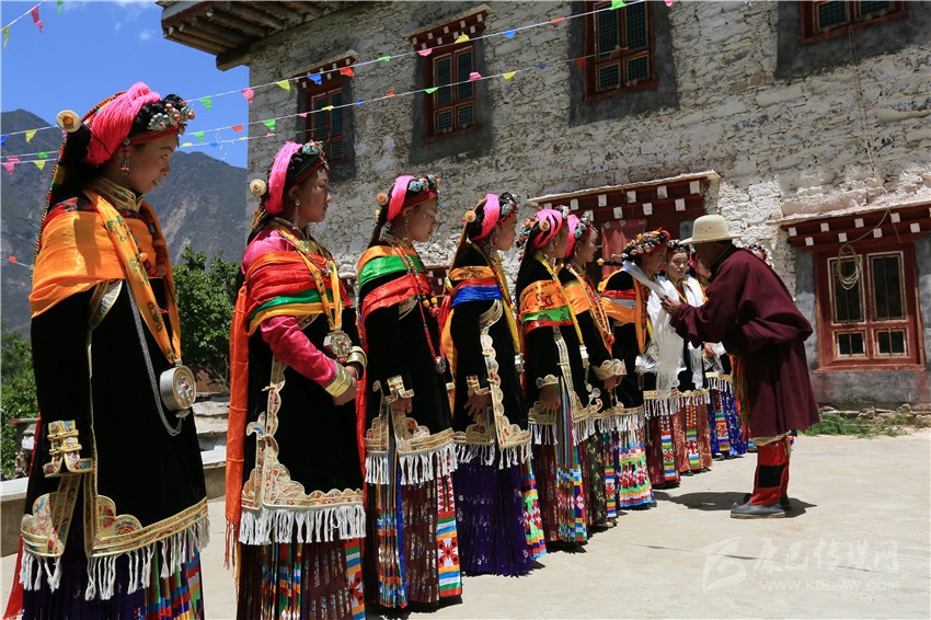 丹巴嘉絨藏族女子的成年禮一般以自然村落為單位,舉行的時間需請喇嘛或貢巴擇吉日,或在農(nóng)事有閑的時候。參加成年禮的成年女性人數(shù)不定,可集體、也可以單獨舉行,其原則是女子必須歲足17歲;若已足17歲,如遇農(nóng)事繁忙,也可適當(dāng)延期。