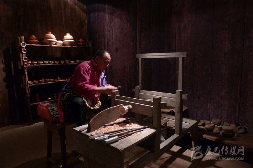 一處古色古香的展柜上,各種藏式木制茶具、碗散發(fā)著古老質(zhì)樸的氣息,天然的花紋自然流暢,色澤婉轉(zhuǎn)溫厚。距離展柜較近的地方,兩架可手工操作的藏式木制機(jī)器有規(guī)律地運(yùn)轉(zhuǎn)著,來自得榮的格絨次仁父子正在機(jī)器上演示藏式木碗的制作過程。
