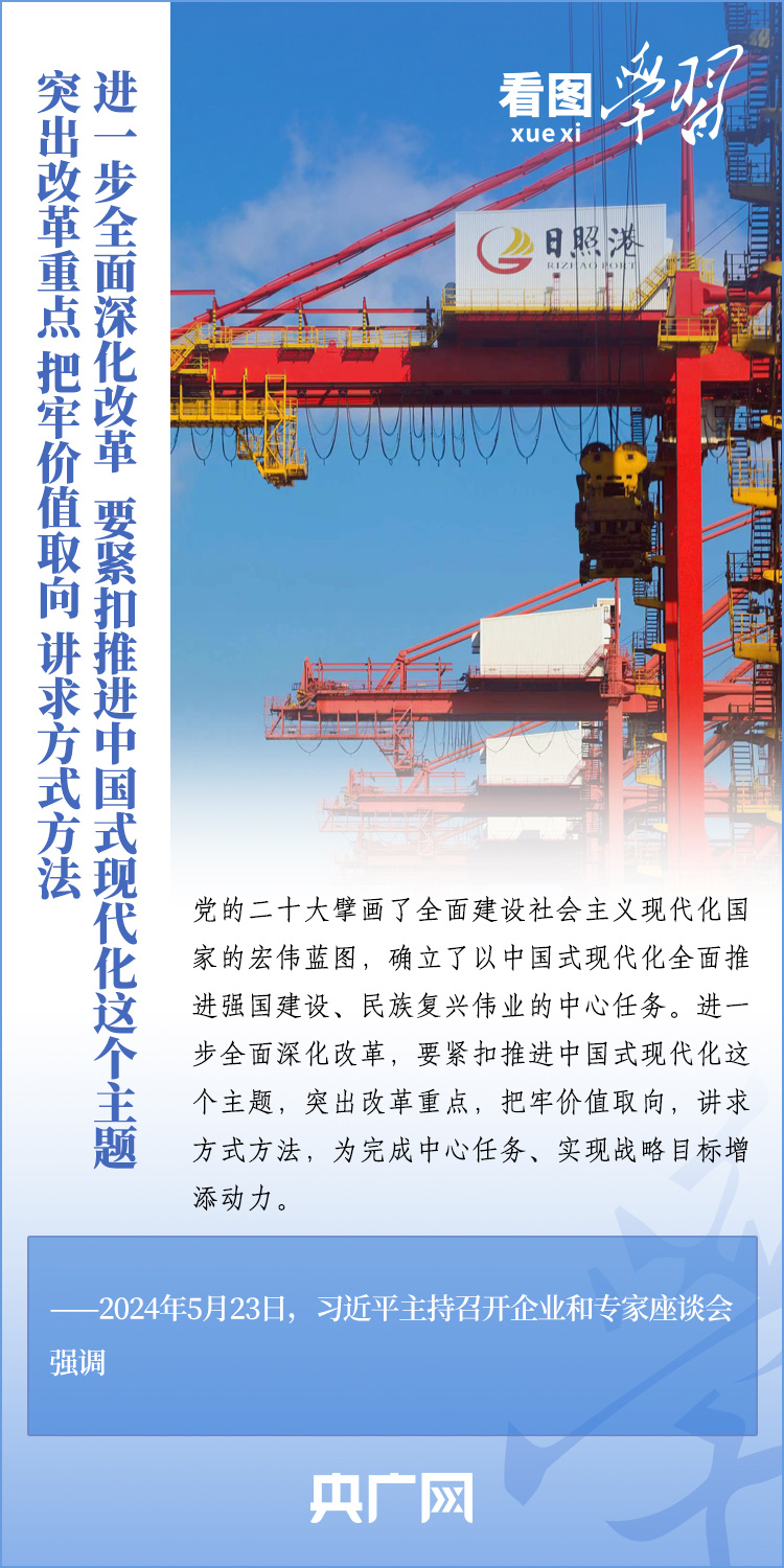 改革是發(fā)展的動(dòng)力。5月23日,習(xí)近平總書(shū)記在山東濟(jì)南主持召開(kāi)企業(yè)和專(zhuān)家座談會(huì)并發(fā)表重要講話??倳?shū)記強(qiáng)調(diào),進(jìn)一步全面深化改革,要緊扣推進(jìn)中國(guó)式現(xiàn)代化這個(gè)主題,突出改革重點(diǎn),把牢價(jià)值取向,講求方式方法,為完成中心任務(wù)、實(shí)現(xiàn)戰(zhàn)略目標(biāo)增添動(dòng)力。一起來(lái)學(xué)習(xí)!