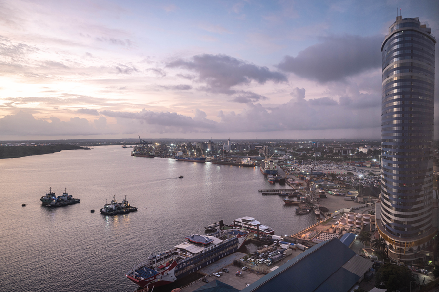 ??這是2023年12月29日拍攝的日出時分的坦桑尼亞達(dá)累斯薩拉姆港。新華社記者 王冠森 攝