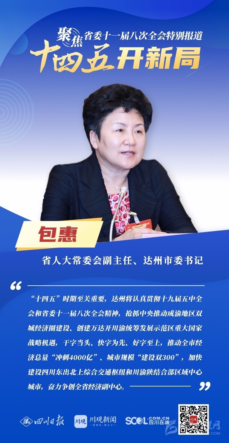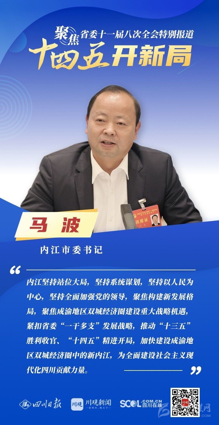 12月3日,中共四川省委十一屆八次全會在成都開幕,全會將深入學習貫徹黨的十九屆五中全會精神,審議《中共四川省委關于制定四川省國民經(jīng)濟和社會發(fā)展第十四個五年規(guī)劃和二〇三五年遠景目標的建議(討論稿)》,為未來5年乃至更長時期四川發(fā)展謀劃新藍圖 。