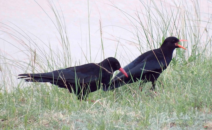 離開養(yǎng)老院,隊(duì)員們沿著小路漫步時(shí),看見了大量的巖羊、狼和狐貍的糞便。當(dāng)隊(duì)員們正在十分愜意地欣賞著這里的美景時(shí),隊(duì)員老蔣突然站在一塊巖石上大呼小叫起來,因?yàn)橐恢桓咴脧乃磉吪苓^,嚇了一跳。隊(duì)員們隨著高原兔跑過的方向,抬頭向那陡峭的崖壁張望,希望能看到巖羊或雪豹的蹤跡,然而只看見一群紅嘴山鴉在追逐著一只乘風(fēng)盤旋的胡兀鷲。
