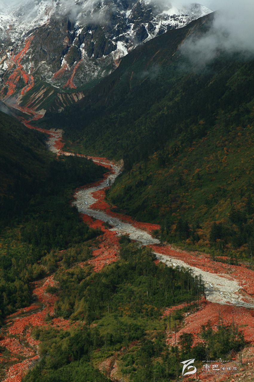 總起來(lái)說(shuō),紅石灘是這樣一壁畫屏:兩黛山之間,為一大溝;大溝飛流直下,紅石如瀑增多,至平地,紅石成片,如水瀉地;在兩黛山及大溝的背后,為一壁雪山,冰清玉潔,十分醒目。